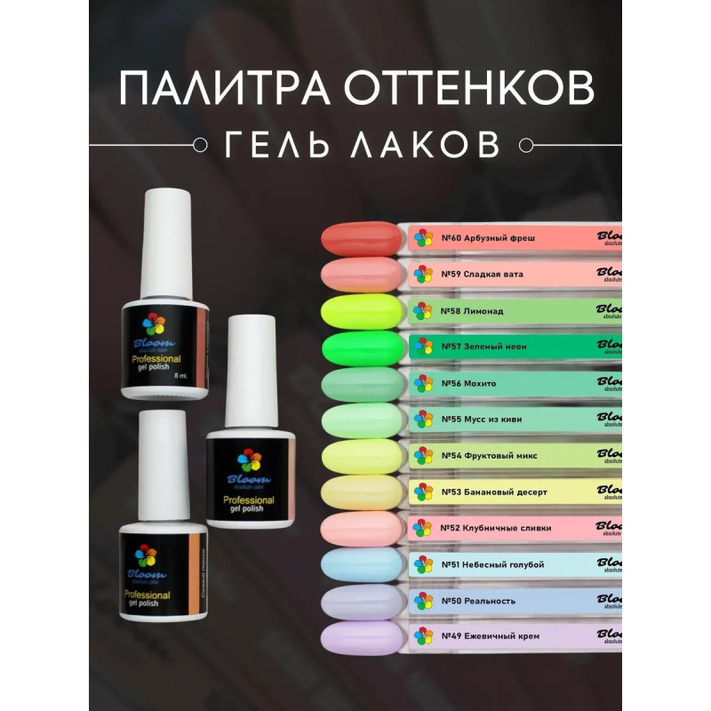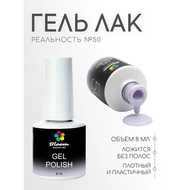 Гель-лак Bloom Реальность (№50) 8 мл. 90% оттенков имеют плотный стабильный пигмент. Каучуковая основа, пластичные. Сочетаются с базами и топами других фирм.