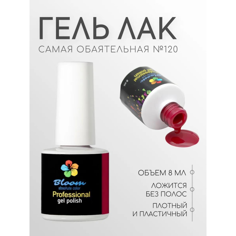 Гель-лак Bloom Самая обаятельная (№120) 8 мл. 90% оттенков имеют плотный стабильный пигмент. Каучуковая основа, пластичные. Сочетаются с базами и топами других фирм.