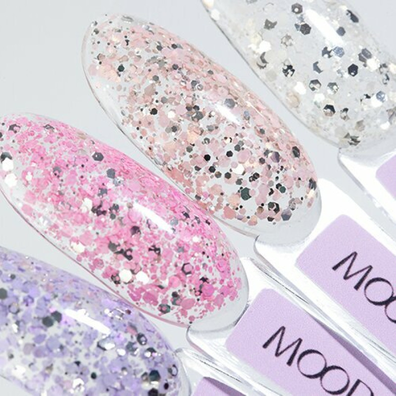 В линейке гель-лаков MOODNAIL Glitch собраны трендовые осенние цвета в виде крупных блёсток-шестигранников. Они создают невероятный глитч-эффект, приковывающий внимание. Блёстки разного размера удобно ложатся и создают выразительный дизайн.