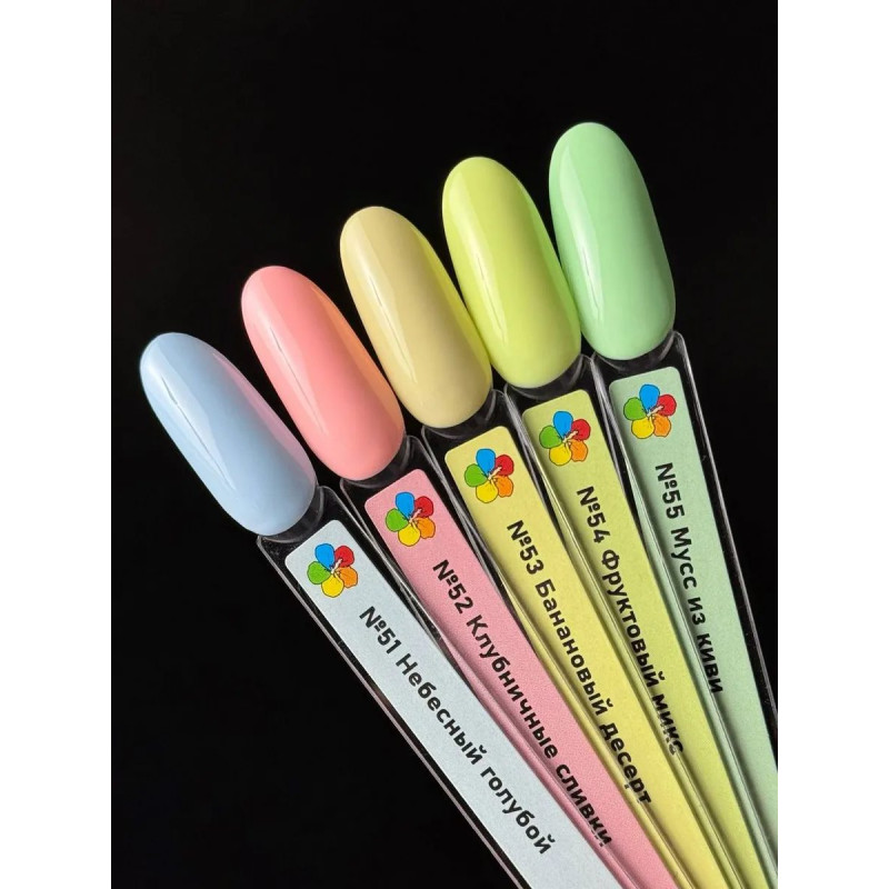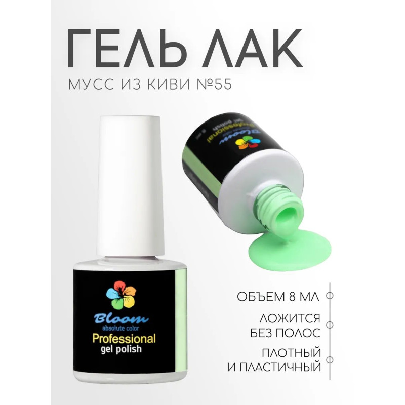 Гель-лак Bloom Мусс из киви (№55) 8 мл. 90% оттенков имеют плотный стабильный пигмент. Каучуковая основа, пластичные. Сочетаются с базами и топами других фирм. Средняя консистенция, не текут. Имеют остаточную липкость. Сушить в УФ 2 минуты, в ЛЕД 1 минуту.
