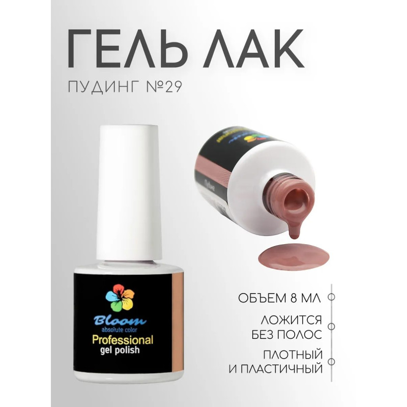 Гель-лак Bloom Пудинг (№29) 8 мл. 90% оттенков имеют плотный стабильный пигмент. Каучуковая основа, пластичные. Сочетаются с базами и топами других фирм.