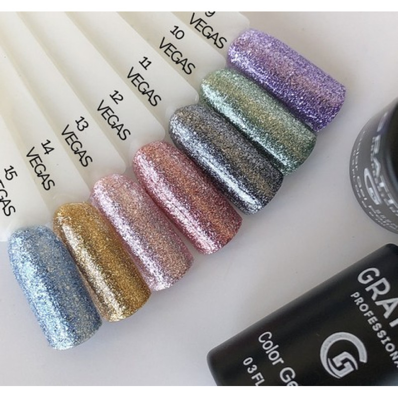 Гель-лаки Grattol коллекции Vegas — это покрытия с тончайшими осколками слюды в разных оттенках золота и серебра. Достаточно плотные, не требуют подложки. Нереальный блеск в одном слое.