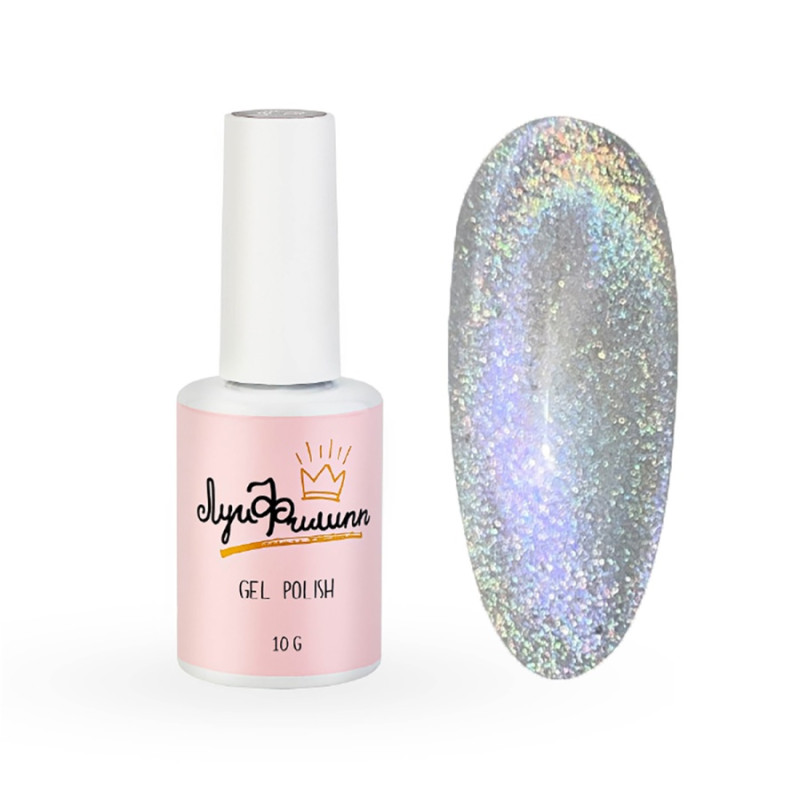Гель-лак с эффектом голографического кошачьего глаза. Магнитный, голографический, светоотражающий. Можно использовать как самостоятельный полупрозрачный цвет или на подложку из любого цвета. Не полосит и не растекается.