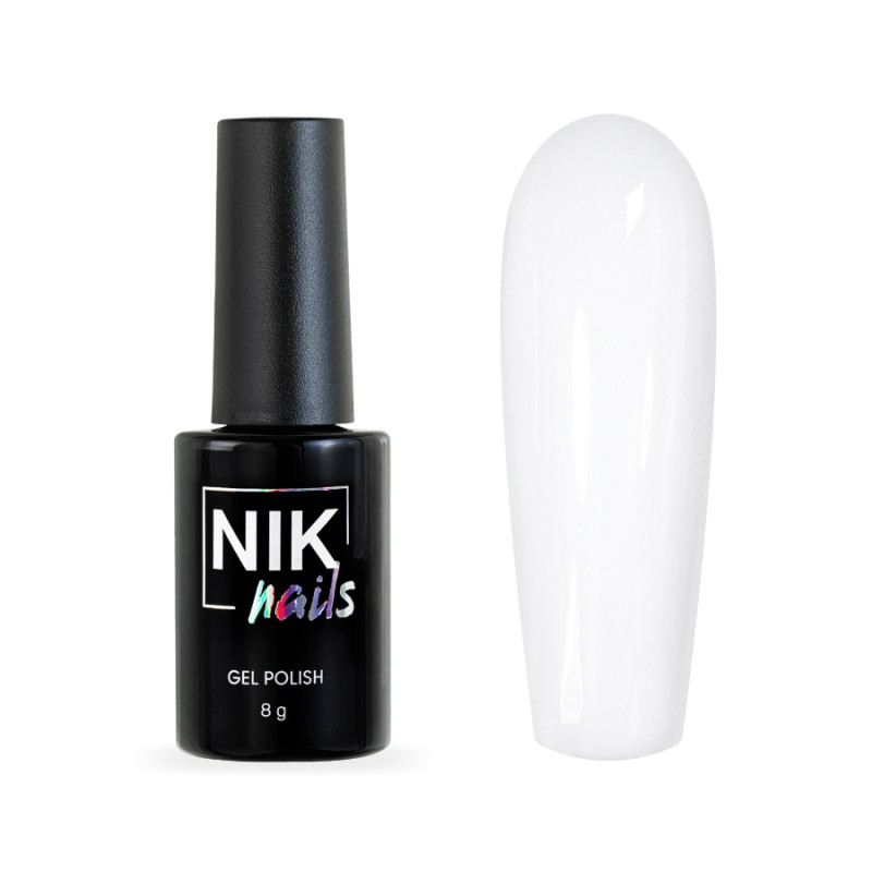 NIK nails white — максимально пигментированный оттенок, плотный при нанесении, а также самовыравнивается. Отлично наносится, не растекается, устойчив к сколам.