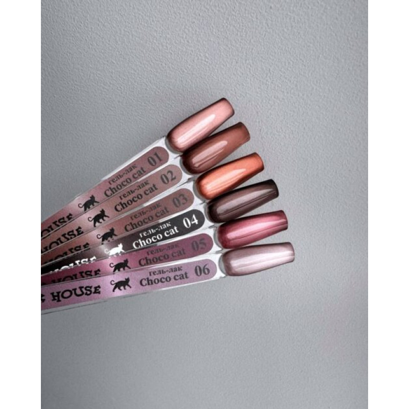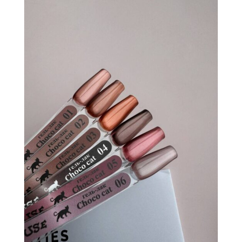 Коллекция CHOCO CAT объединяет шоколадно-кофейные тёплые оттенки. Она включает 6 цветов с мельчайшими магнитными частицами тонкого помола. Эти оттенки универсальны и подойдут для любого образа, особенно для сдержанного стиля.