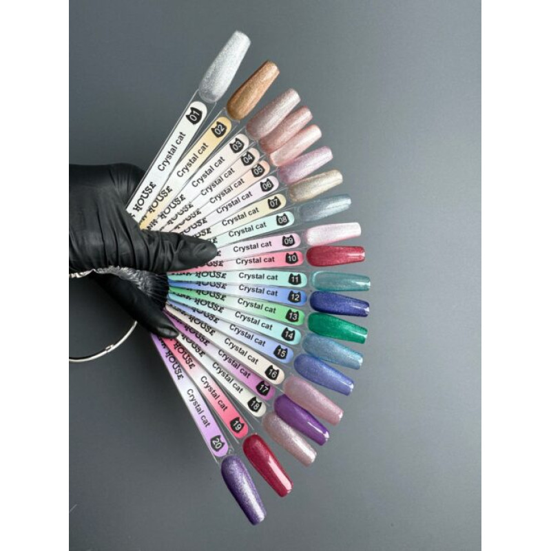 Серия кошек Crystal cat закрывает все задачи. Средний помол магнитных частичек даёт яркий блик и «шелковый» эффект. Коллекция одинаково хороша на светлой и тёмной подложке, причём чем темнее подложка, тем ярче эффект.