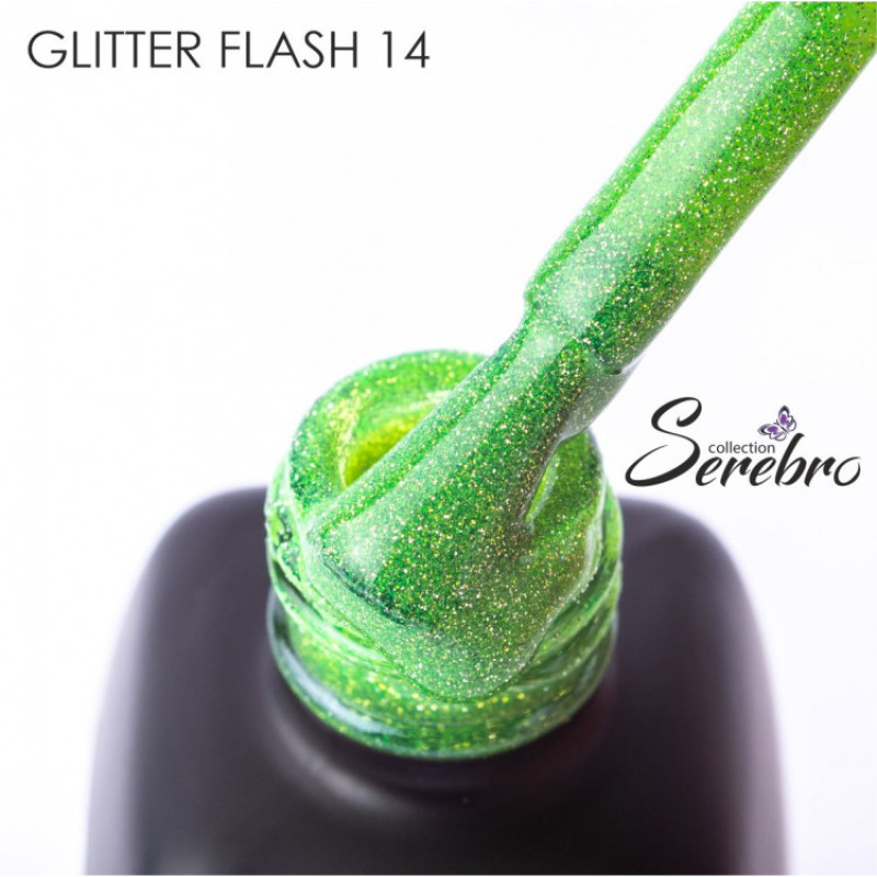 Гель-лак Serebro Glitter flash светоотражающий 14, 11 мл. Гель-лаки коллекции Glitter Flash со светоотражающими частицами обеспечивают изящный блеск с мелкой фракцией шиммера, ослепляют своим сиянием при любом освещении, как в дневное, так и в ночное время. При попадании прямого луча света ногти превращаются в настоящее волшебство.