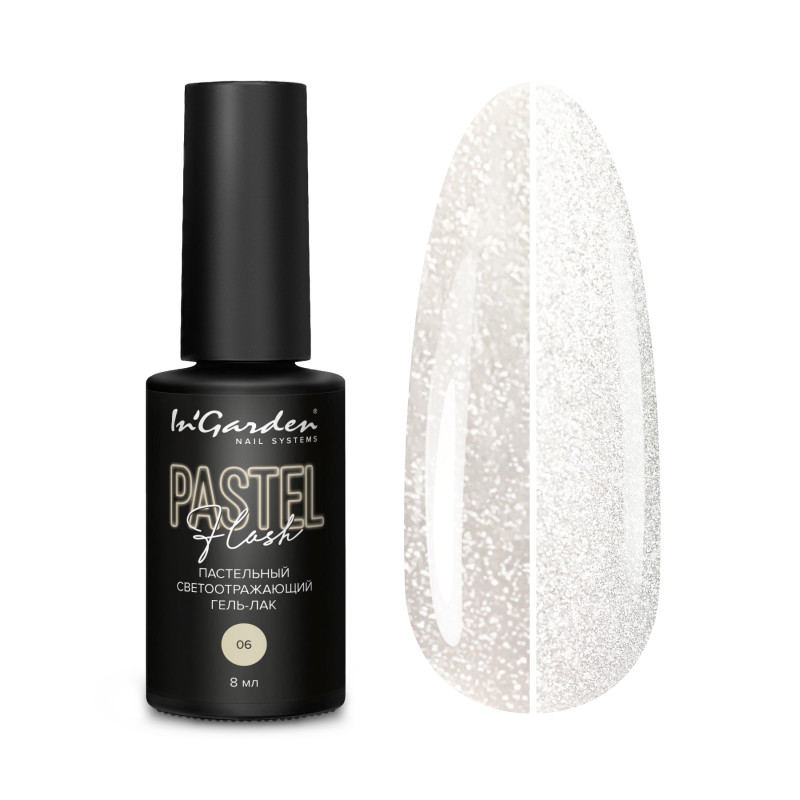 PASTEL FLASH 06 — это молочный оттенок светоотражающего гель-лака с эффектом блесток. Он прекрасно смотрится как самостоятельное нежное покрытие и обладает изюминкой за счет светоотражающего эффекта.