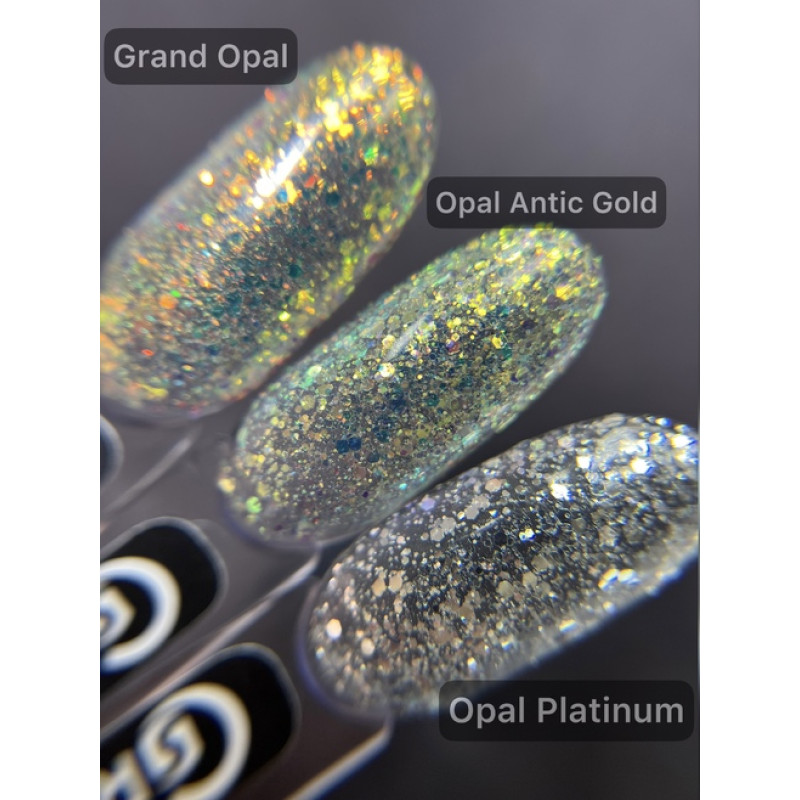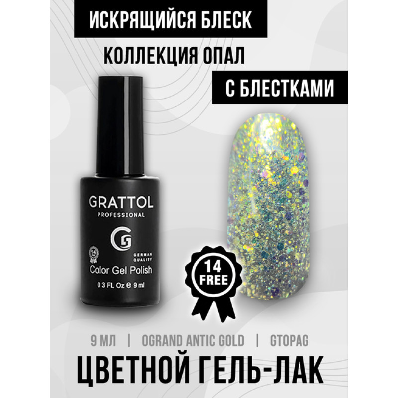 Гель-лак Grattol Opal Antic Gold, 9 мл — плотный гель-лак, имеющий в своём составе частицы, с помощью которых создается эффект «драгоценного камня» на ногтях.