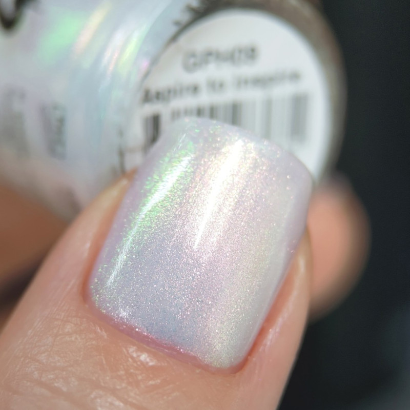 "Aspire to Inspire" — полупрозрачный оттенок розово-золотистого подтона с рассеянным зелено-голубым сиянием. Допускается нанесение в 3-4 тонких слоя. Рекомендовано предварительно покрывать ногтевую пластину слоем базы, несколькими слоями лака и топом для продления стойкости покрытия. Каждый слой сушить на воздухе не меньше 2-5 минут.