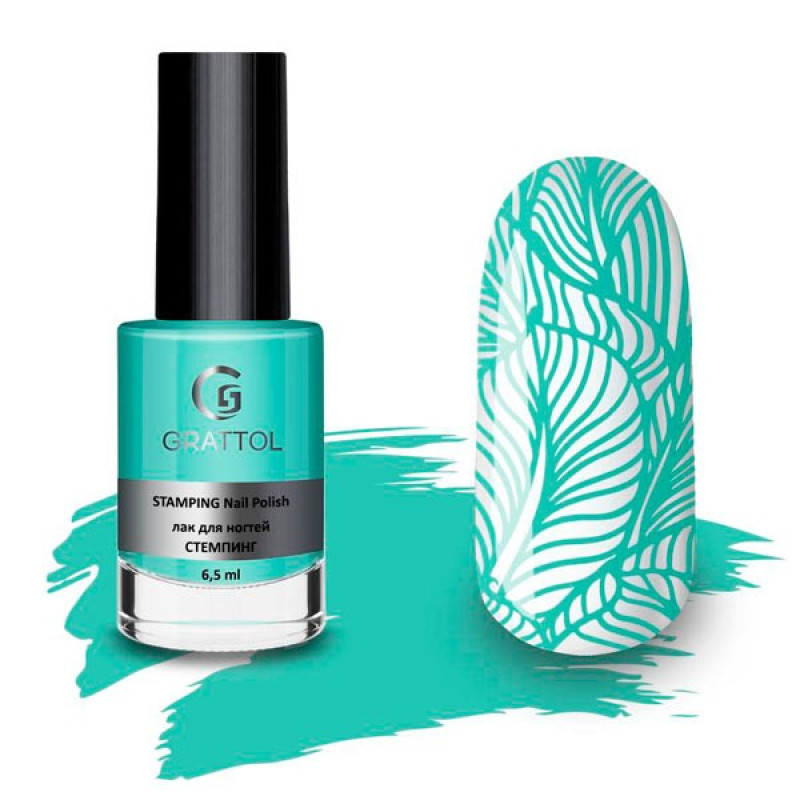 Grattol "08 Mint" — лак для стемпинга, сохнущий на воздухе. Применим в нейл-арте как с гель-лаками, так и с обычными лаками для ногтей. Благодаря плотной консистенции легко переносит даже сложные рисунки. Оттенок — мятный кремовый.