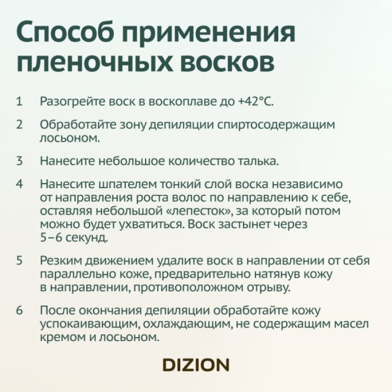 При нанесении тонким слоем воск застывает в течение 3-4 секунд, что позволяет провести процедуру быстро и эффективно. Во время процедуры клиент испытывает минимум болевых ощущений, а после использования на коже нет раздражений и покраснений. Продукт рекомендован для применения как дома, так и в салонах красоты.