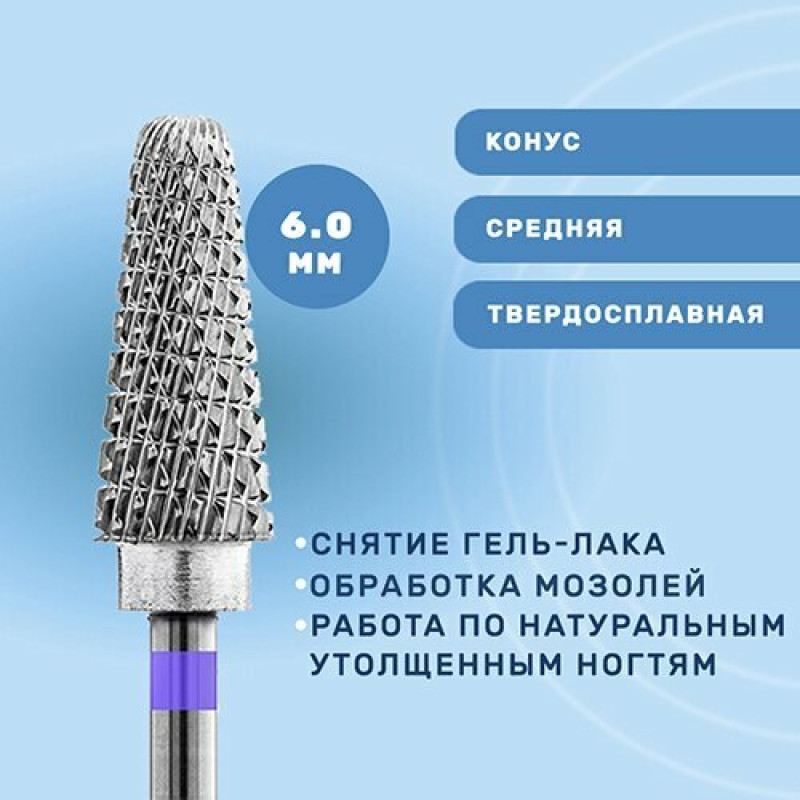 Фреза конус с крестообразно-поперечной нарезкой, средняя. Применяется в аппаратном маникюре и педикюре для снятия гель-лака, обработки мозолей, удаления части ногтевой пластины и работы по натуральным утолщенным ногтям.