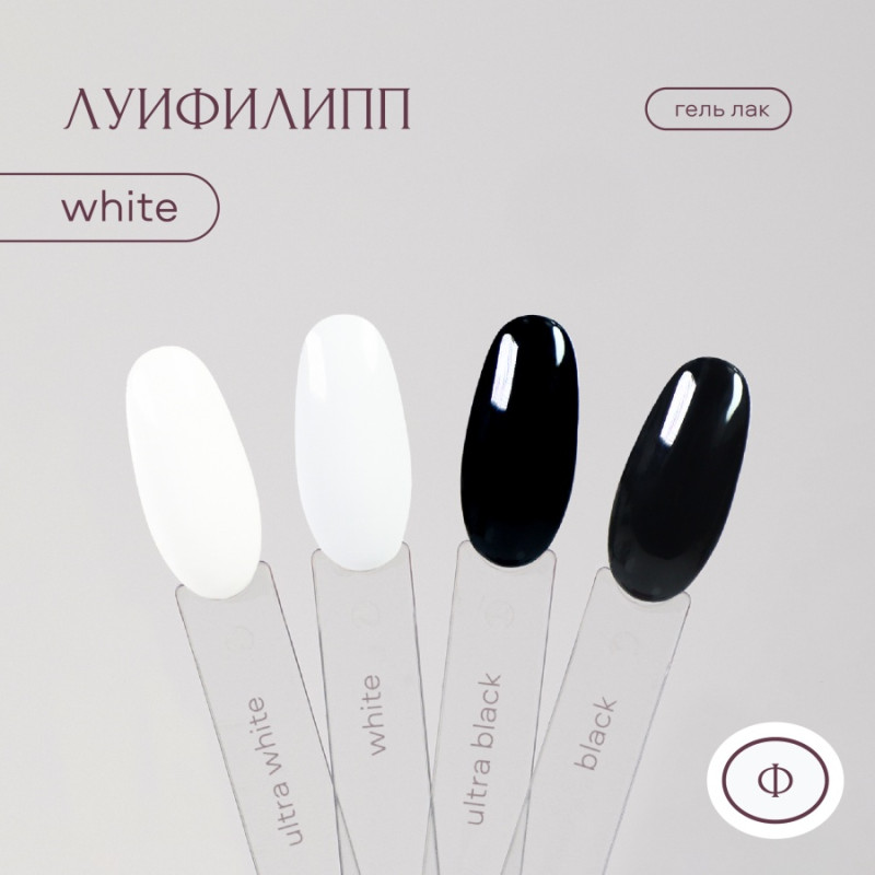Гель-лак White от торговой марки Луи Филипп белого цвета. Максимально пигментированный оттенок, плотный при нанесении, а также самовыравнивается. Не полосит и не растекается. Обладает мягкой текстурой и комфортной вязкостью.