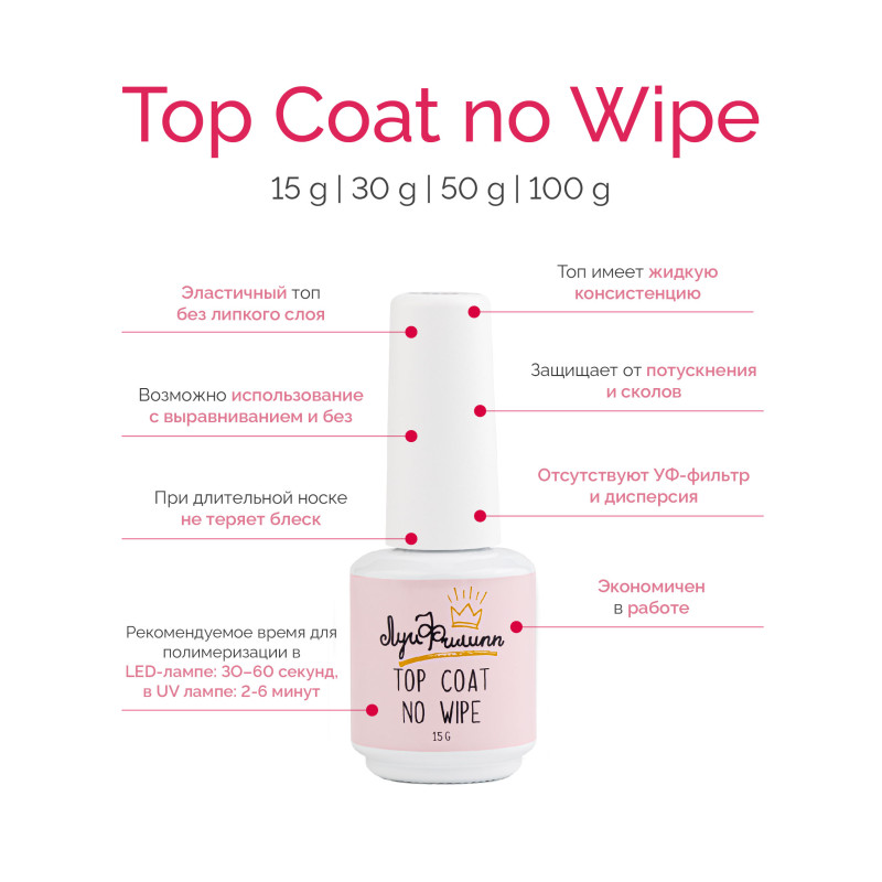 Финишное покрытие Top Coat no wipe от Луи Филипп. Топ без липкого слоя обладает средней плотностью, удобен при нанесении даже начинающему мастеру. Он устойчив к сколам, трещинам, царапинам и потускнениям, обеспечивает прочность и приятно блестит, не теряя блеск при длительной носке. Покрытие не желтеет, не темнеет и защищает цвет от высветления и выгорания. Оно жидкое и эластичное, ложится плотным стеклянным слоем, экономично в работе и подходит для покрытия с выравниванием.
