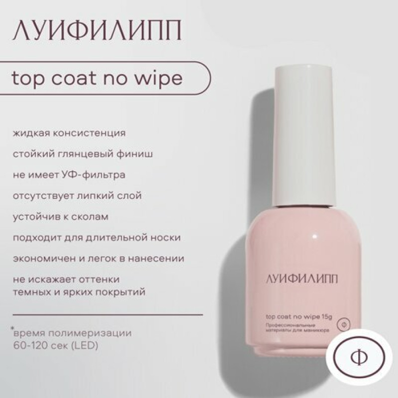 Финишное покрытие Top Coat no wipe от Луи Филипп. Топ без липкого слоя обладает средней плотностью, удобен при нанесении даже начинающему мастеру. Он ложится плотным стеклянным слоем, экономичен в работе и не теряет блеск при длительной носке.