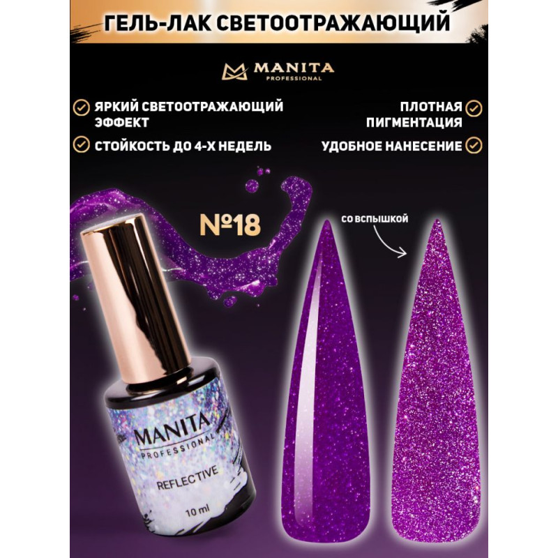 Гель-лак Manita Reflective для маникюра и педикюра — это новинка. Его состав включает специальные частицы — фотоинициаторы, которые придают невероятное сияние при вечернем освещении со светодиодными лампами или при использовании фотовспышки.