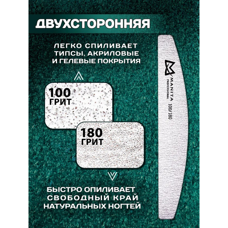 Форма лодки обеспечивает удобство в использовании и позволяет легко обрабатывать ногти. Градация 100 идеально подходит для быстрого снятия верхнего слоя и коррекции формы, а градация 180 завершает процесс, придавая ногтям гладкость и аккуратный вид.