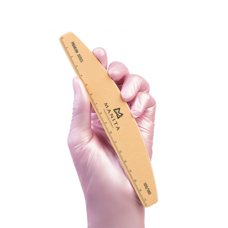 Пилка для ногтей MANITA PROFESSIONAL Лодка PREMIUM "ЛИНЕЙКА" песочного цвета с градацией 100/180 — это отличный инструмент для мастеров маникюра. Яркая надпись "ЛИНЕЙКА" символизирует точность и аккуратность.