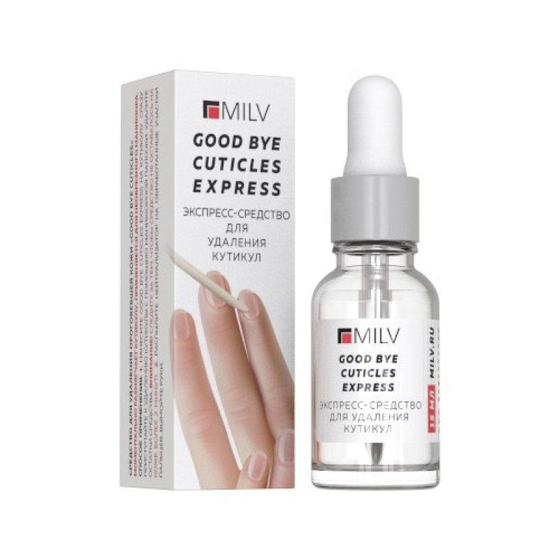 Средство MILV для удаления кутикулы ЭКСПРЕСС, 15 мл. Профессиональное средство для моментального удаления кутикулы. Повышенное содержание активных компонентов способствует быстрому размягчению и растворению кутикулы. Благодаря более жидкой консистенции, средство быстро проникает во все участки обрабатываемой поверхности. Начинать процесс удаления кутикулы можно сразу после нанесения. При регулярном использовании (не более одного раза в неделю) рост кутикулы заметно замедляется.