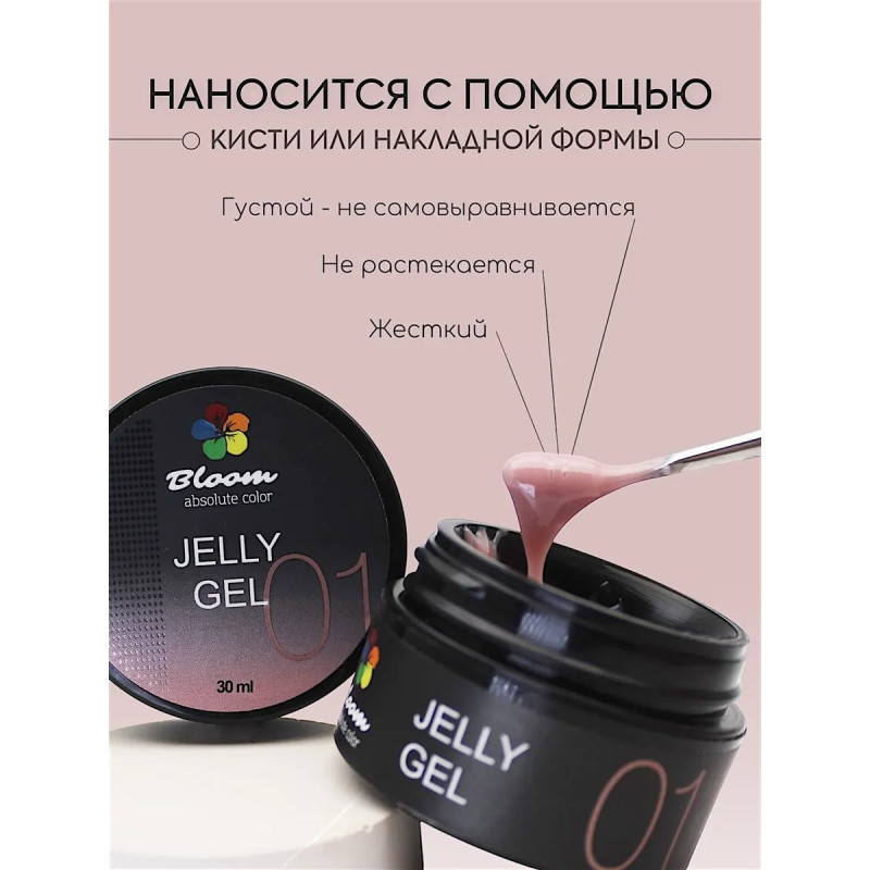 Гель-желе Bloom 15мл камуфлирующий 01. Воздушный, как мусс, и крепкий, как акрил. Легко опиливается, держит форму и не растекается.
