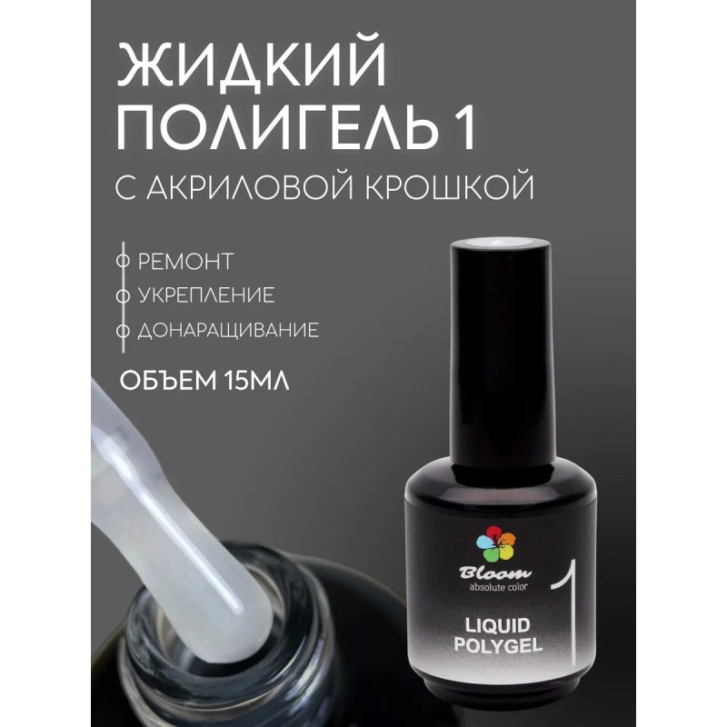 Полигель Bloom жидкий акрил №01, 15 мл. Жидкий полигель с акриловой пудрой в составе, придающей дополнительную прочность. Подходит для укрепления, моделирования тонких ногтей и работы с верхними и нижними формами.