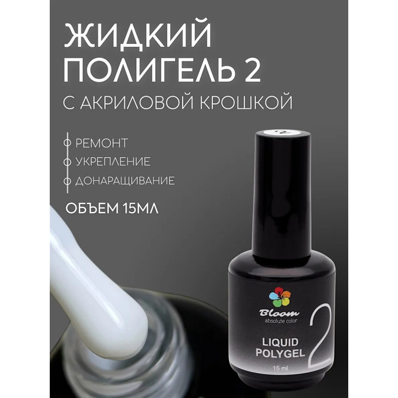 Полигель Bloom жидкий акрил №02, 15 мл. Жидкий полигель с акриловой пудрой. Жесткий и прочный, подходит для укрепления, для верхних и нижних форм.
