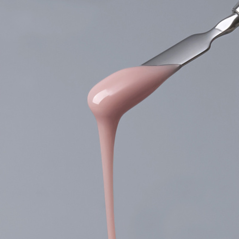 Материал имеет среднюю степень вязкости, самовыравнивается при нанесении, легко моделируется кистью и поджимается через 40–60 секунд. Перекрывает линию свободного края только при наслоении и остается полупрозрачным у кутикулы, что позволяет ему незаметно отрастать.
