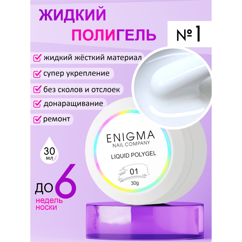 Жидкий полигель Enigma Liquid Polygel — это материал для укрепления ногтей и донаращивания минимальной длины. Он имеет среднюю жесткость, держит форму, не дает усадку на длинных ногтях и отлично укрепляет среднюю длину. Подходит для всех типов ногтей.