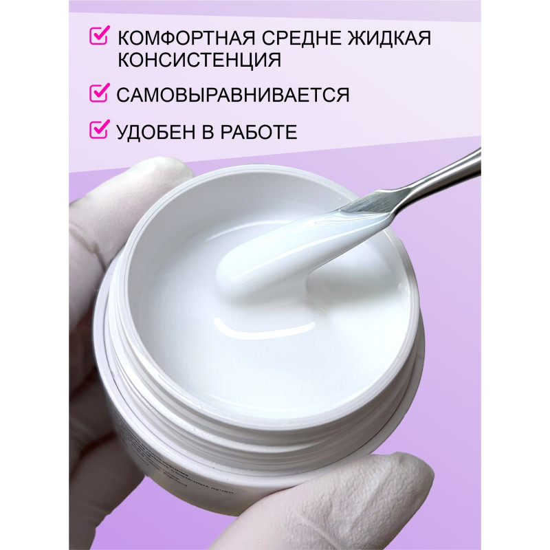 Материал обладает средне-жидкой консистенцией, легко наносится и распределяется. Он не имеет запаха, обладает повышенной прочностью и пластичностью, не растекается. После полимеризации становится устойчивым к внешним воздействиям. Позволяет создавать натуральные и эстетичные ногти в тонком слое, которые держатся долго без частой коррекции.
