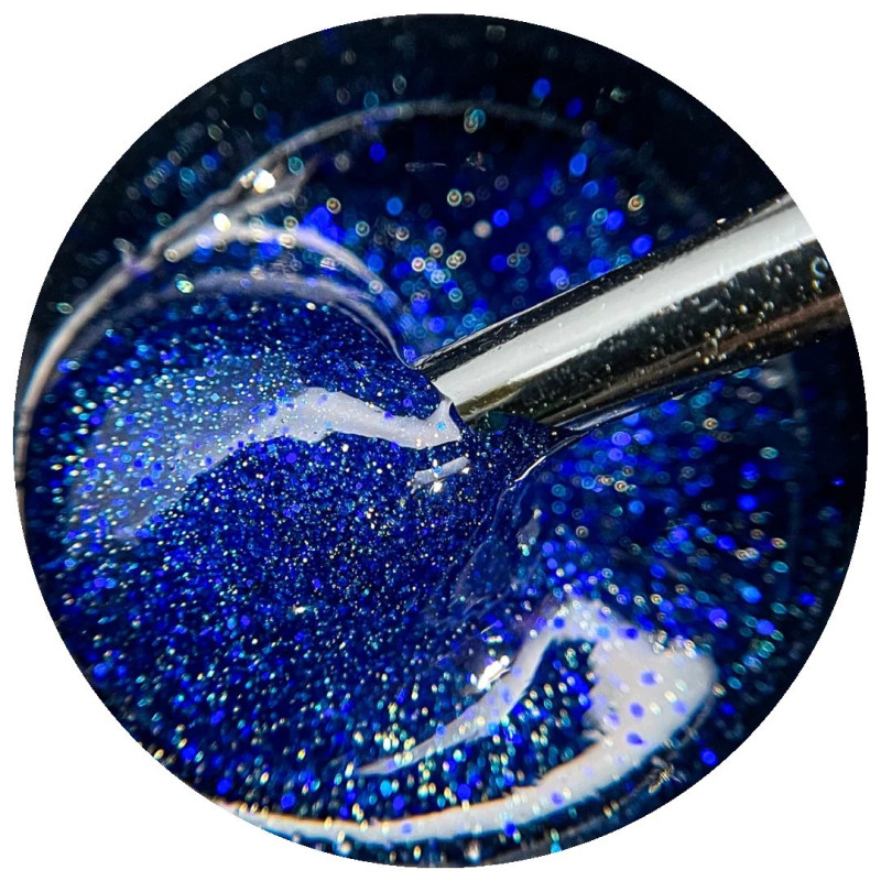 Жесткий полупрозрачный синий гель с мелкими блестками. Идеален для наращивания любой длины и формы, имеет приятную и комфортную для работы консистенцию. За сравнительно небольшое время встает в ровный блик, очень удобен для техники "без опила". Кроме вышеперечисленного, мастера любят его за отсутствие жжения при полимеризации. Необходимо наносить на базовое покрытие.