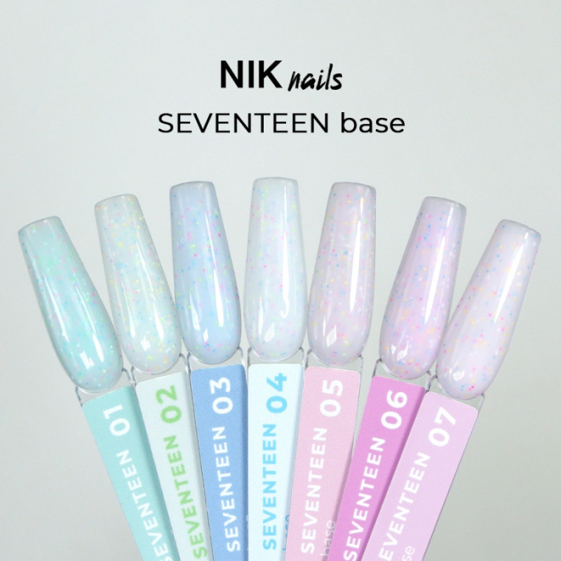 Камуфлирующая база NIK nails Seventeen с цветным вкраплением. Имеет средне-густую консистенцию, отлично наносится, самовыравнивается и устойчива к сколам. Покрытие получается гладким и ровным.