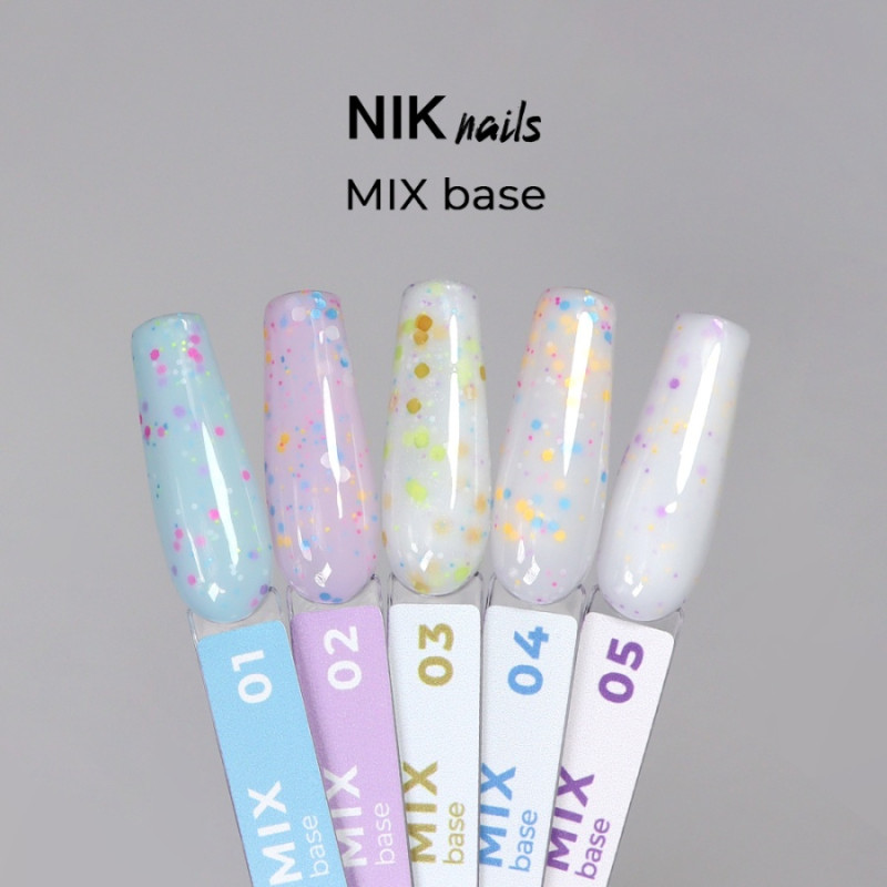 Камуфлирующая база NIK nails Mix — коллекция из 5 оттенков, состоящих из множества разноцветных звездочек и частиц на полупрозрачной основе. Имеет средне-густую консистенцию, отлично наносится, самовыравнивается и устойчива к сколам. Покрытие получается гладким и ровным.