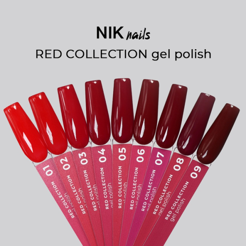 Коллекция «Red» от ТМ NIK nails. Палитра оттенков от алого до гранато-винного, чтобы каждая смогла найти свой тот самый красный цвет. Цвета плотные, не полосят и не растекаются.