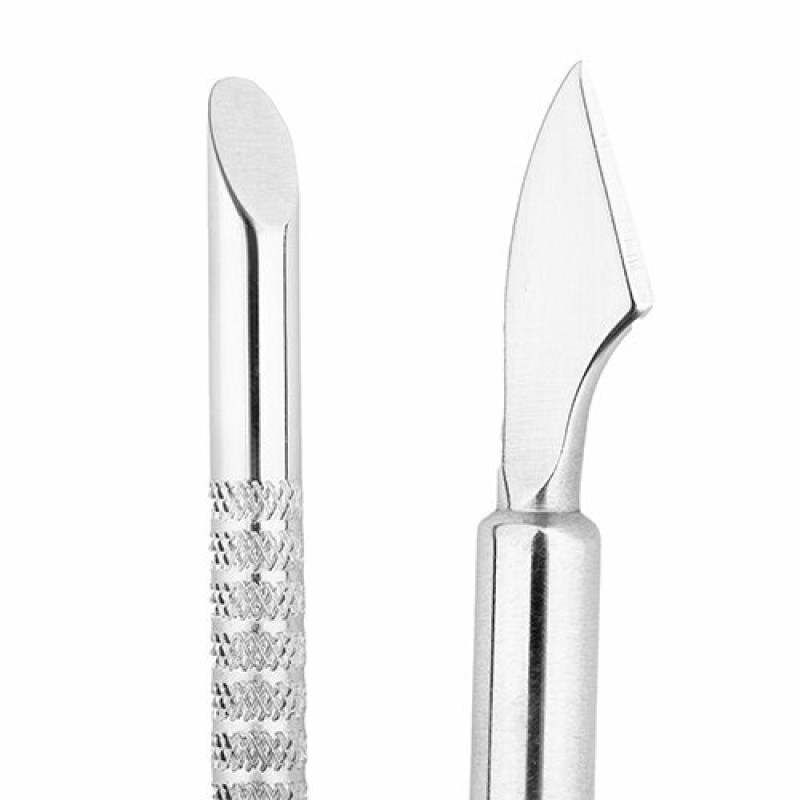 Маникюрный пушер в форме «апельсиновой палочки» или «копытца» является одним из самых популярных инструментов. Данная модель представляет собой комбинацию пушера P-04 (копытце) и пушера P-06, от которого взят второй рабочий край в виде топорика.