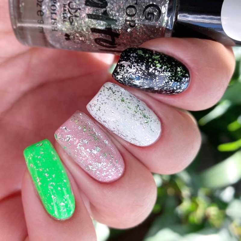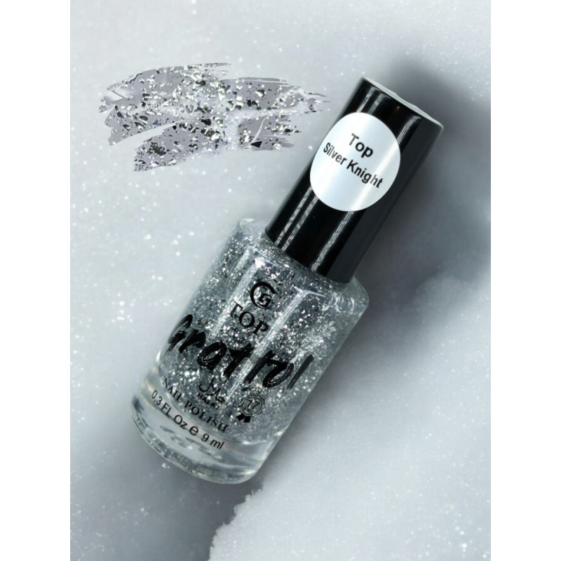 "Silver Knight" — прозрачный топ с серебряной поталью. Является универсальным покрытием для любой цветной подложки и способен заменить десяток лаков с начинкой, так как уникально сочетается с любым оттенком.