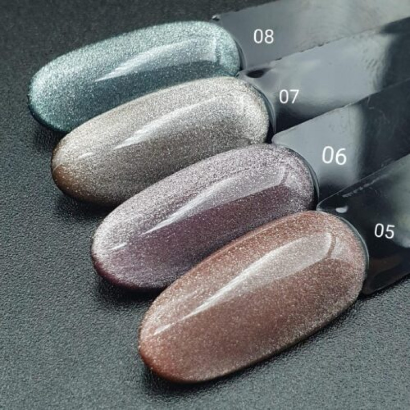 Серия кошек Crystal cat закрывает все задачи. Средний помол магнитных частичек даёт яркий блик и «шелковый» эффект. Коллекция одинаково хороша на светлой и тёмной подложке, причём чем темнее подложка, тем ярче эффект.