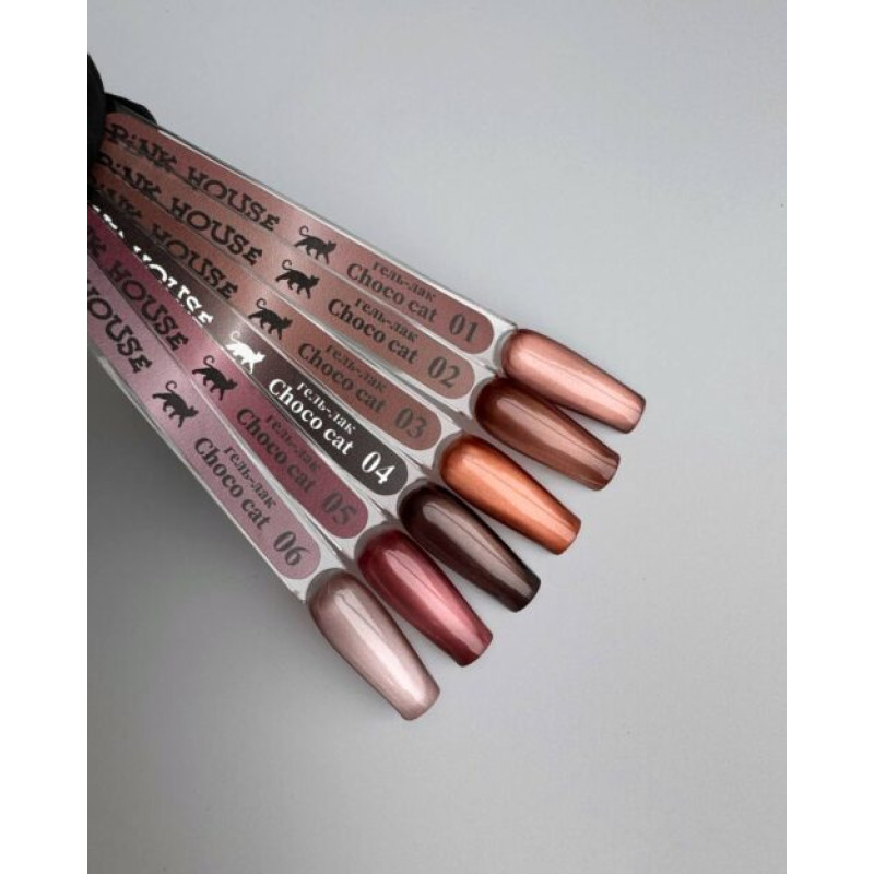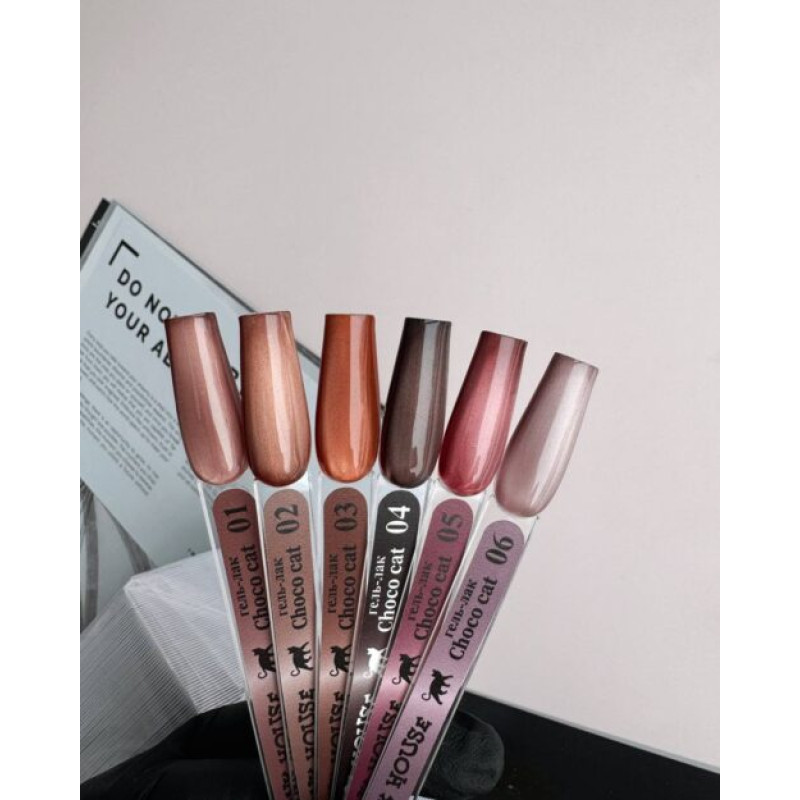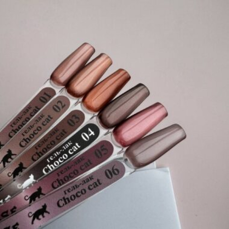 Коллекция CHOCO CAT объединяет шоколадно-кофейные тёплые оттенки. Она включает 6 цветов с мельчайшими магнитными частицами тонкого помола. Эти оттенки универсальны и подойдут для любого образа, особенно для сдержанного стиля.