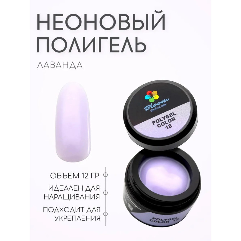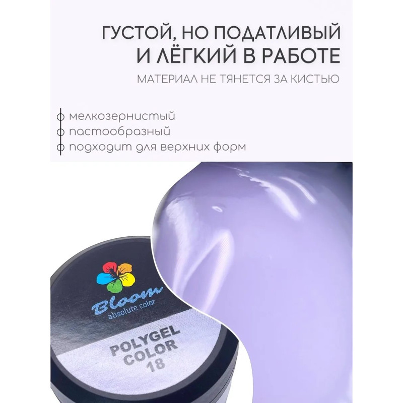Полигель акригель для ногтей Bloom №18 — фиолетовый лавандовый нежный. Это универсальный материал, сочетающий лучшие характеристики акрила и геля. Обладает отличной консистенцией, удобен в работе как для профессионалов, так и для новичков.