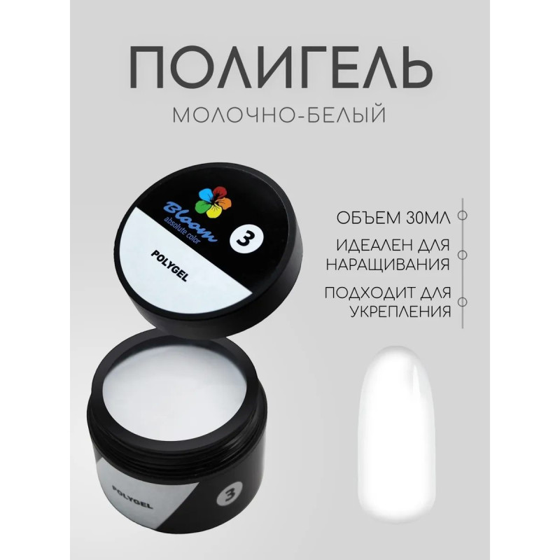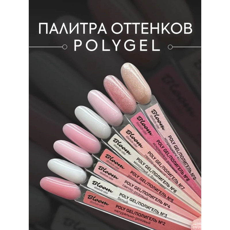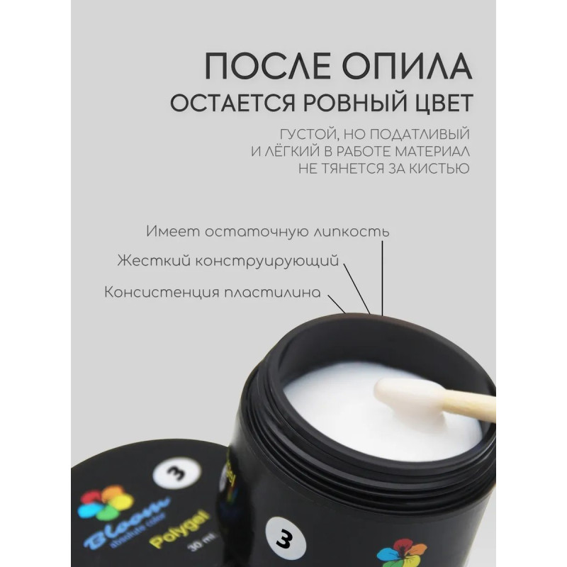 Полигель Bloom — густой, но податливый и лёгкий в работе материал, не тянется за кистью. Имеет консистенцию пластилина и остаточную липкость. После опила остается ровный цвет без белых точек.