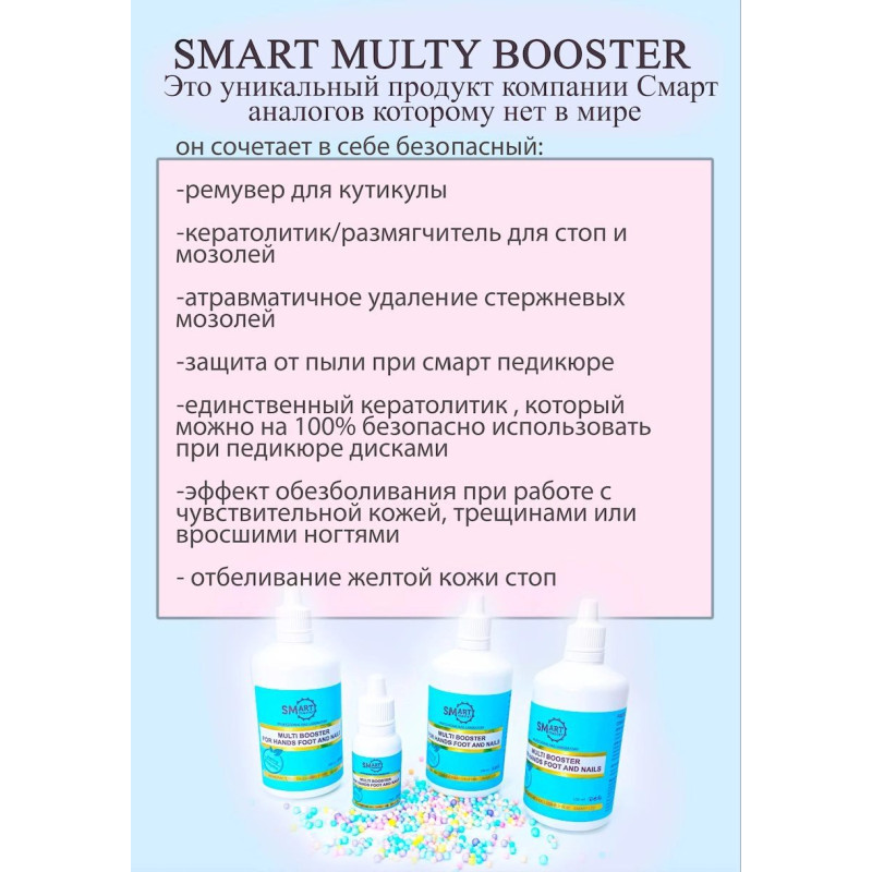 Multi Booster для стоп и ногтей — многофункциональный кератолитик-ремувер нового поколения на основе энзимов. Он разработан для удаления грубой кожи, ороговевшей кутикулы, натоптышей и мозолей, в том числе стержневых. Продукт не содержит мочевины, щелочи и кислот, поэтому его можно наносить даже на воспаленный ноготь. Он деликатно воздействует на кожу, оставляя её увлажнённой и напитанной.