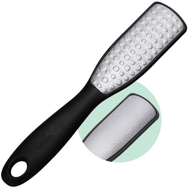 Лазерная профессиональная двухсторонняя терка для ног прекрасно справляется с огрубевшей кожей. На металлической поверхности имеются мелкие насечки, которые не травмируют кожный покров. Ручка терки выполнена из высокопрочного пластика и удобно лежит в руке.