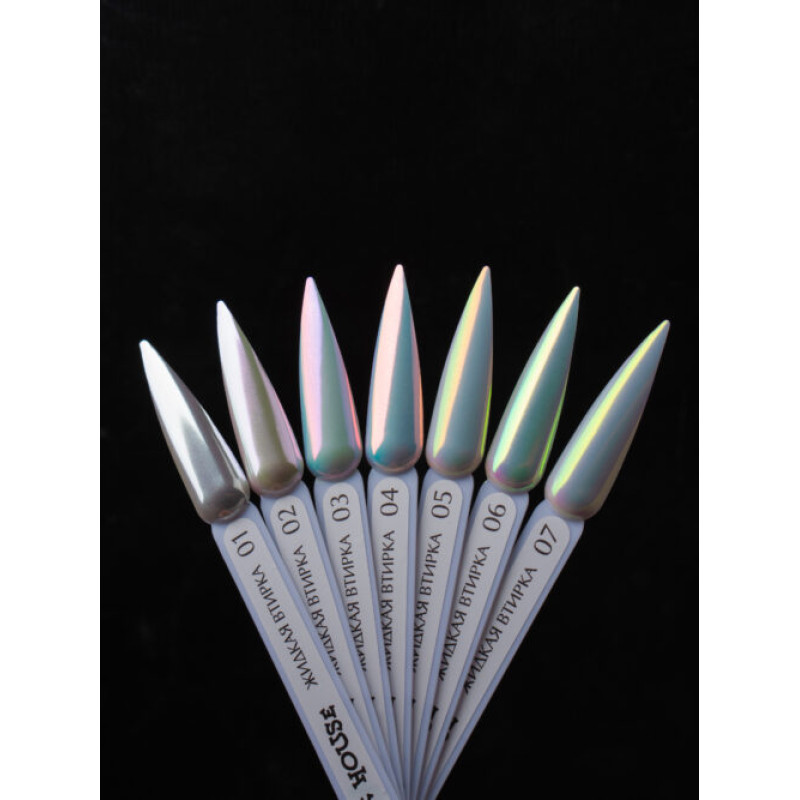 Как пользоваться: обезжирить готовый ноготь с покрытием, нанести небольшое количество втирки, подождать несколько секунд, интенсивно втереть до полного высыхания и зеркального блеска, перекрыть топом для втирки.